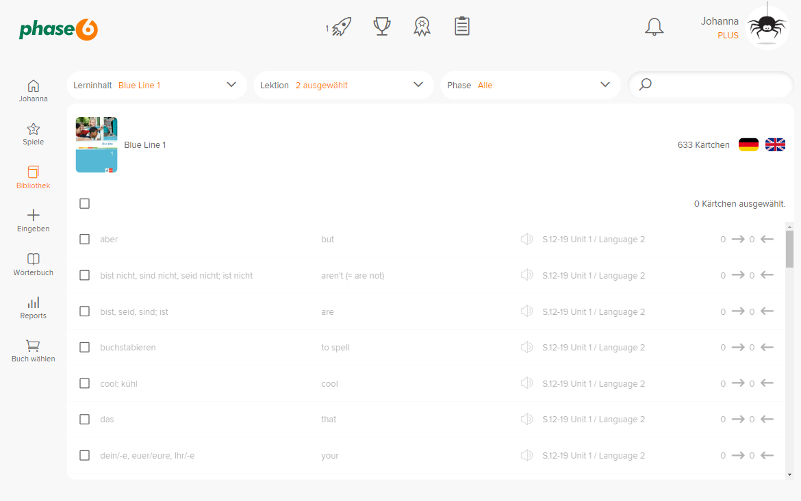 Ob Vokabeln oder Grammatik: Mit phase6 lernst du nicht nur das Richtige richtig gut, sondern auch mit Spaß und Pepp. Erlebe Sidney, der vor Begeisterung eine la Ola macht, verdiene dir Punkte, Skins und lustige Avatare.
