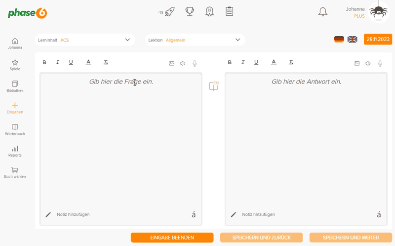 Du kannst mit jedem Paket Vokabeln eingeben oder mit fertigen Vokabelsammlungen lernen.